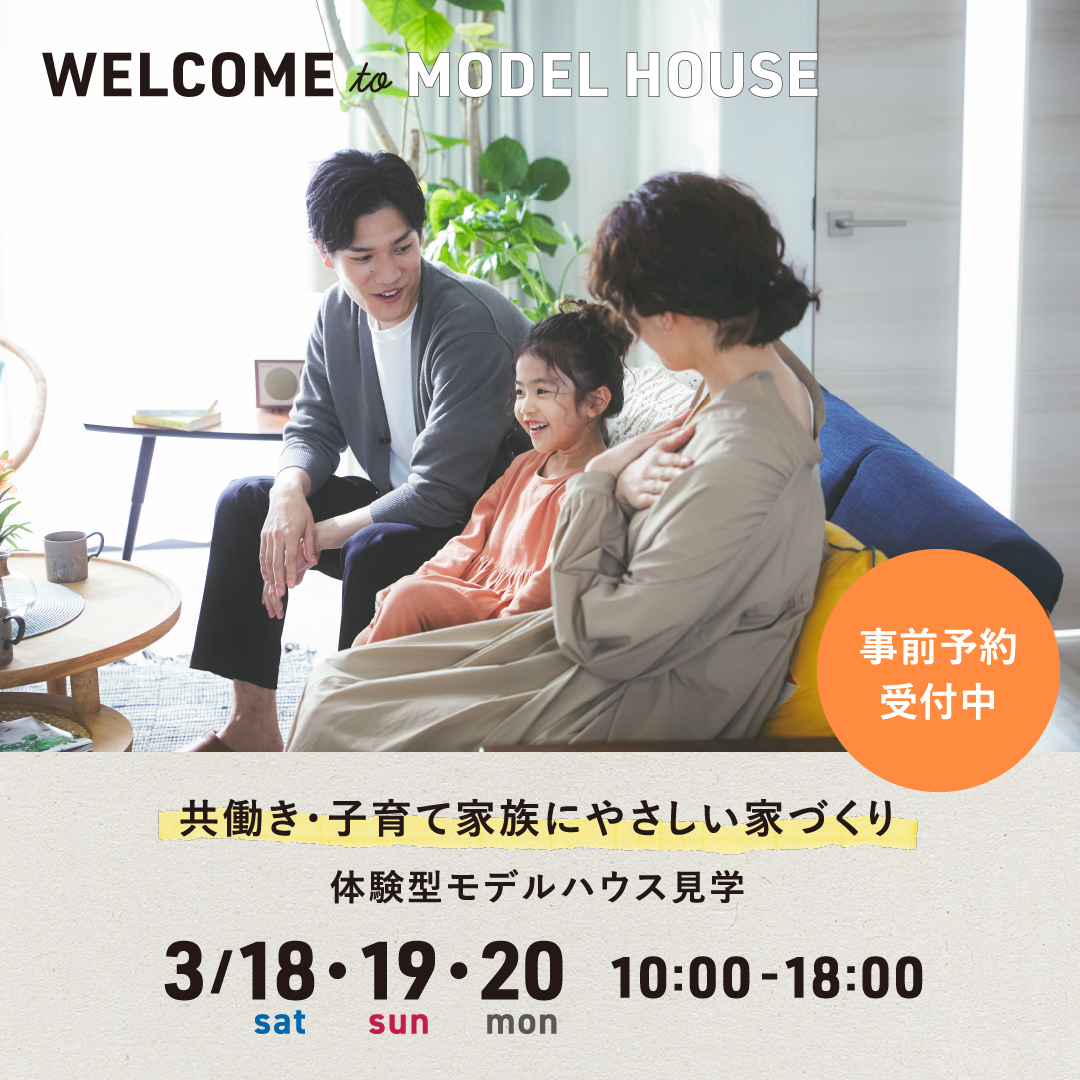 3/18㈯~20㈪は、体験型モデルハウス見学会~共働き・子育て家族にやさしい家づくり~を開催します。