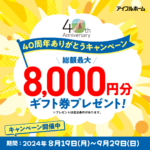 2024年8月26日 / 最終更新日 : 2024年8月26日 Ishii イベント 【8/19~9/29まで】40周年記念\ありがとうキャンペーン/~第2弾~【アイフルホーム白河店】 【最大8,000円分ギフト券プレゼント】40周年記念\ありがとうキャンペーン/~第2弾~ キャンペーン期間:2024/08/19㈪~9/29㈰ 期間中にアイフルホームの見学会予約フォームアンケートにご回答の上、ご来場いた […]